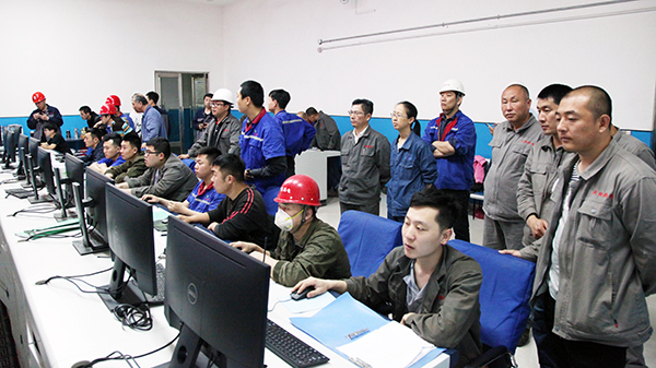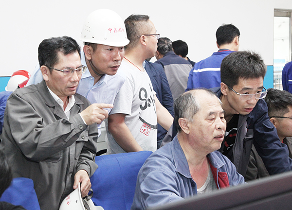 4萬機(jī)組一次并網(wǎng)成功后,集團(tuán)總工程師李成玉(右三)、項(xiàng)目建設(shè)部長(zhǎng)胡林桂(右一)中鑫熱電總經(jīng)理韋毅民(右二)和副總經(jīng)理李樹彬(右四)同部分生產(chǎn)、技術(shù)管理骨干在中控室露出歡快的笑容!